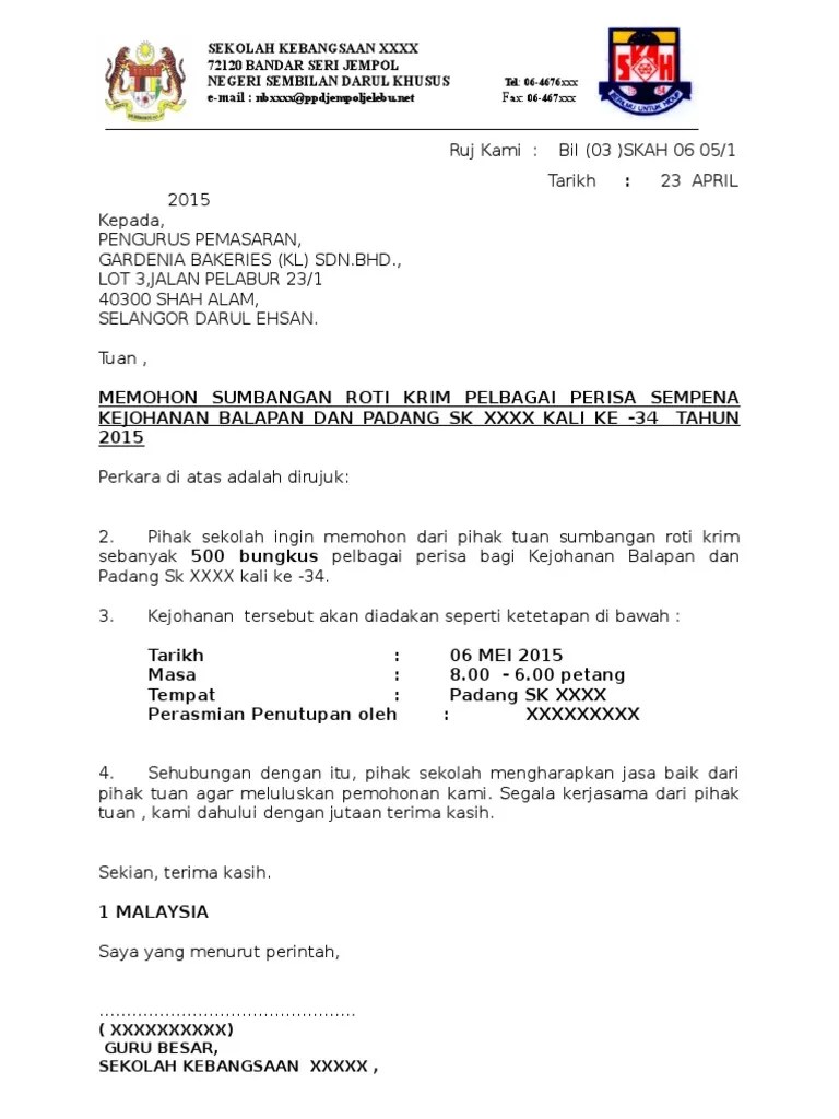 Contoh surat rasmi permohonan sumbangan kewangan surasmi g. Text of contoh surat mohon tajaan. Surat tajaan jm 15 contoh surat memohon tajaan terbaru 2019. Memohon sumbangan kewangan bagi penajaan hadiah bola jaring. Begitu juga di hari sukan, selalunya pihak sekolah akan memohon tajaan dari syarikat minuman seperti nestle, milo, 100 plus dan sebagainya.